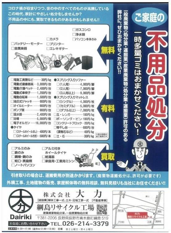 引取も可能です。事前予約で、回収に伺います。