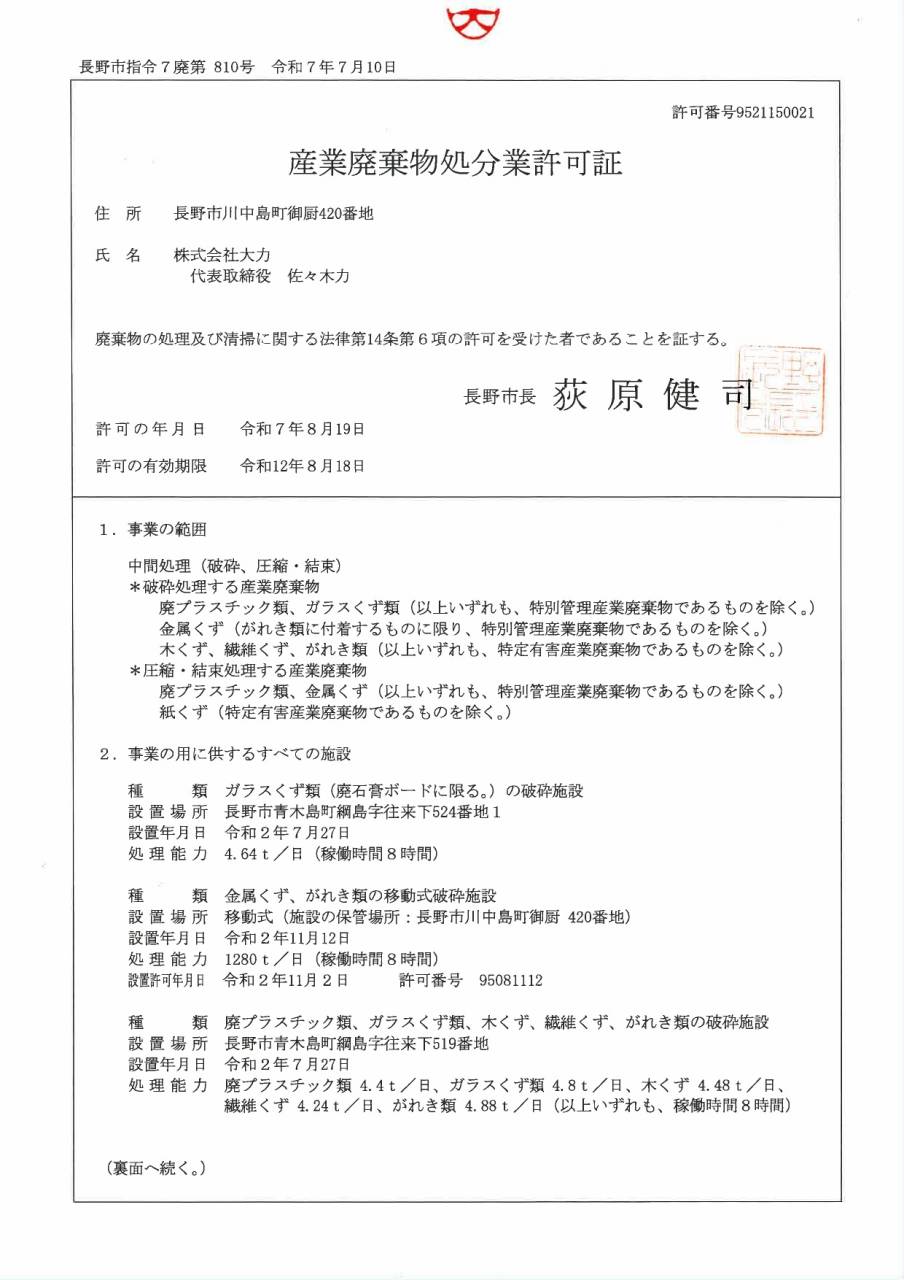 株式会社大力では、産業廃棄物の中間処理を行っています。